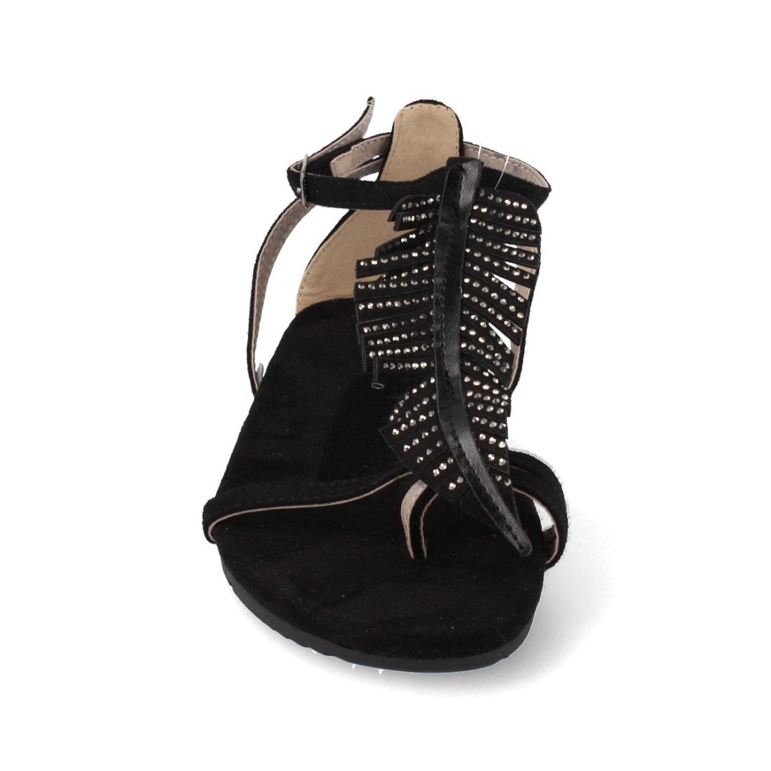 Sandalia plana tipo esclava con cierre de hebilla y hoja de flecos con detalles de pedrería en el empeine.