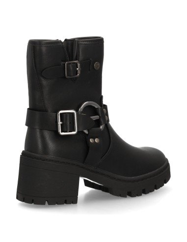 Botín de mujer estilo biker con caña media y cierre lateral de cremallera. Doble hebilla decorativa con aros metálicos. Suela gruesa con tacón ancho. Ideal otoño invierno.