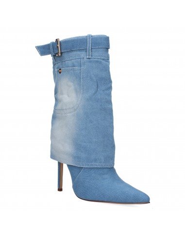 Bota de tacón para mujer, de punta fina y cierre de cremallera y de hebilla, forrada de tela vaquera. Colección otoño invierno 2023