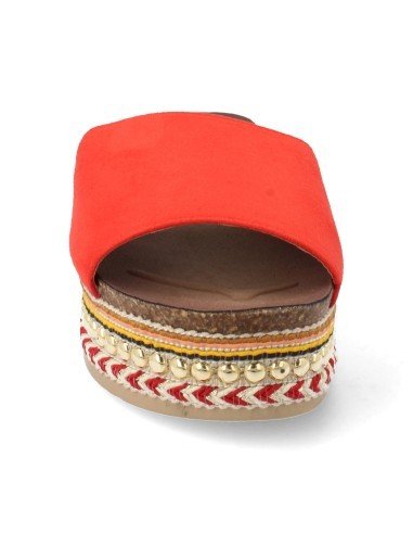 Sandalia de pala simple con piso de bio y yute, tachas metálicas y motivos étnicos.