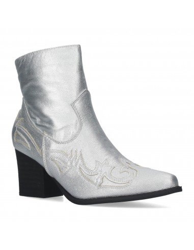 Botines camperos para mujer de tacon medio con adorno estilo cowboy en la puntera y en el talon y cierre de cremallera.