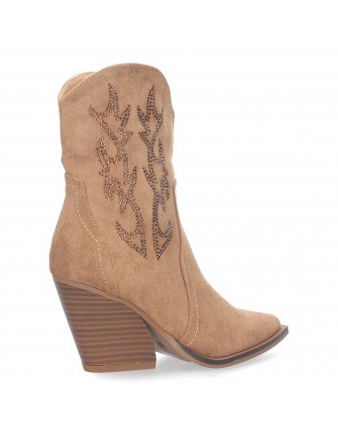 Botin campero con diseño de piedras brillantes en la caña y bordado en el empeine, estilo vaquero modernizado y cierre de cremallera. La caña mide 17’5cm.