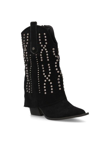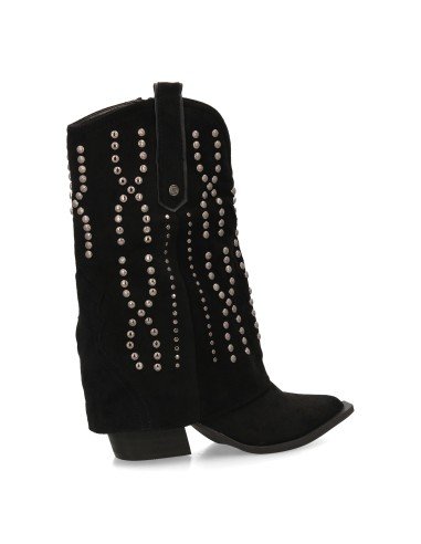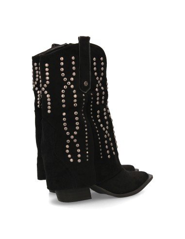Botín cowboy para mujer con caña media y diseño campero. Decorado con tachuelas metálicas en patrón geométrico, punta fina y tacón cubano cuadrado. Ideal para la temporada otoño invierno.
