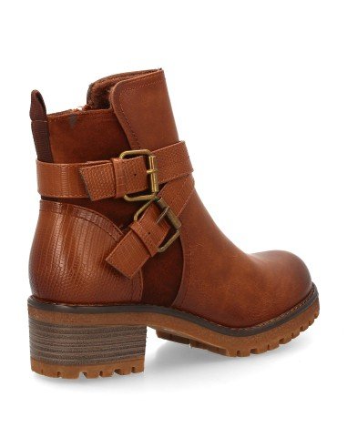 Botín de mujer con tacón. Ideal para los días de Otoño e Invierno. Texturas combinadas con doble hebilla dorada decorativa en el lateral. Suela dentada de goma. Cierre lateral con cremallera.