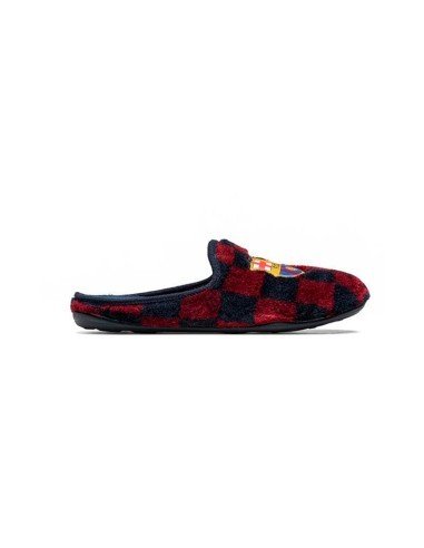 Zapatillas para casa con estampado a cuadros y el escudo del club como protagonista en la pala. Hechas en españa y lavables en lavadora.
