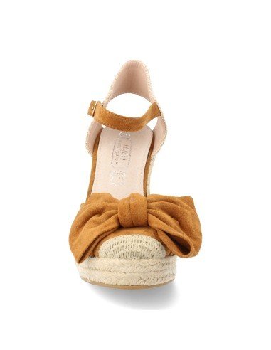 Sandalia de cuña en yute, con el talón descubierto y detalle de lazo en la punta. Planta de piel. Altura: 10 cm.
