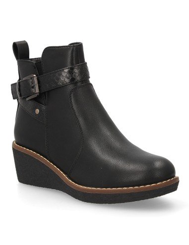 Botín con cuña para mujer, elegante tira con textura de efecto serpiente y hebilla decorativa metálica en el lateral exterior. Cremallera interior ideal para la temporada de otoño invierno.