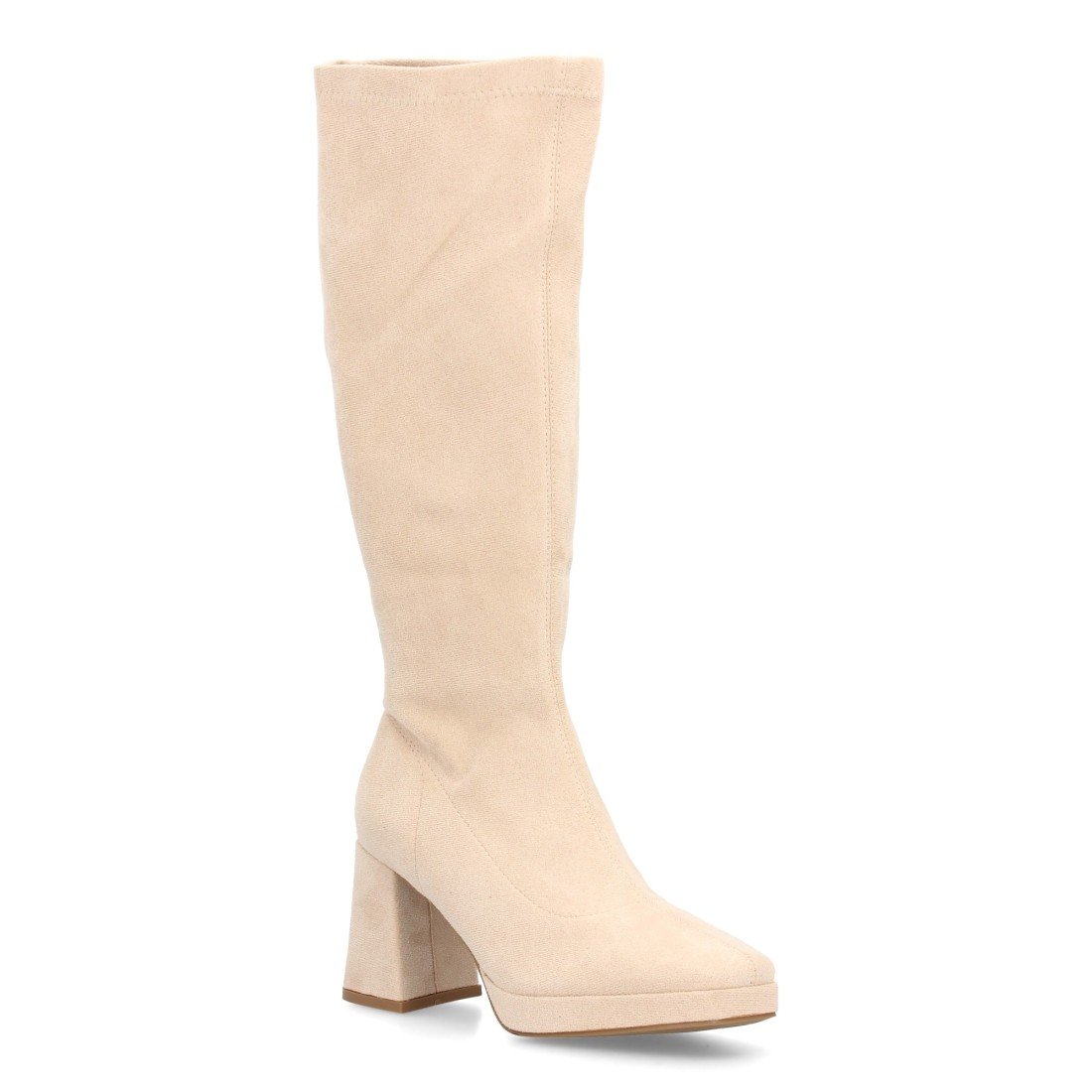 Botas para mujer. Diseño de tejido suave tipo ante, con una caña ceñida que estiliza la pierna y un tacón grueso con plataforma que aporta altura y estabilidad.