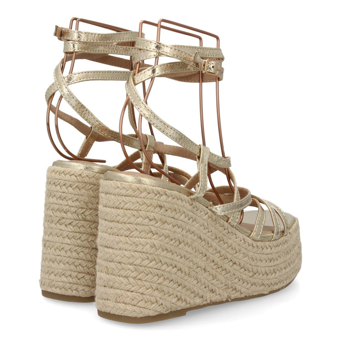 Sandalias de cuña alta estilo romano con plataforma de yute trenzado. Cierre de cuerdas. Diseño de tiras finas envuelve el pie y se ajusta al tobillo. Ideal primavera verano.