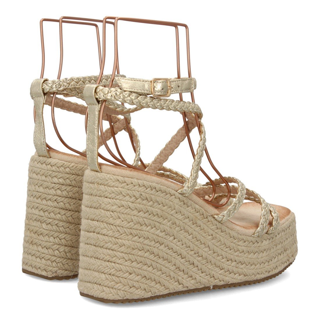 Sandalia de mujer con cuña alta y plataforma de esparto, cierre de hebilla en el tobillo. Plantilla acolchada, ligera. Perfectas para verano, eventos al aire libre o looks casuales