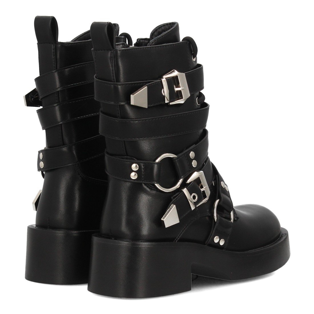Botas para mujer con diseño de múltiples tiras cruzadas adornadas con hebillas metálicas, aros metálicos y detalles tipo tachuelas con cierre de cremallera. Ideal Otoño Invierno.