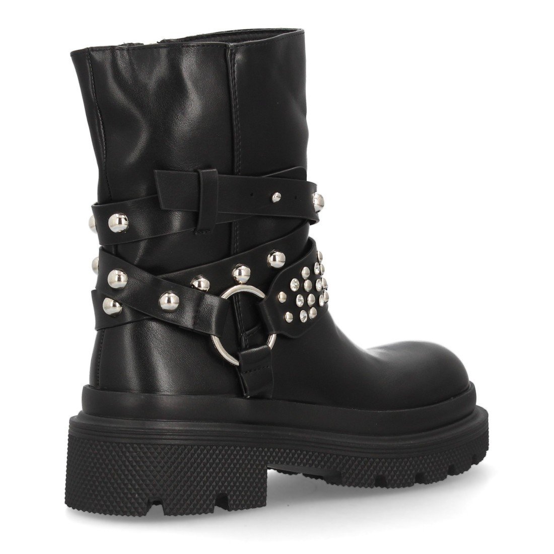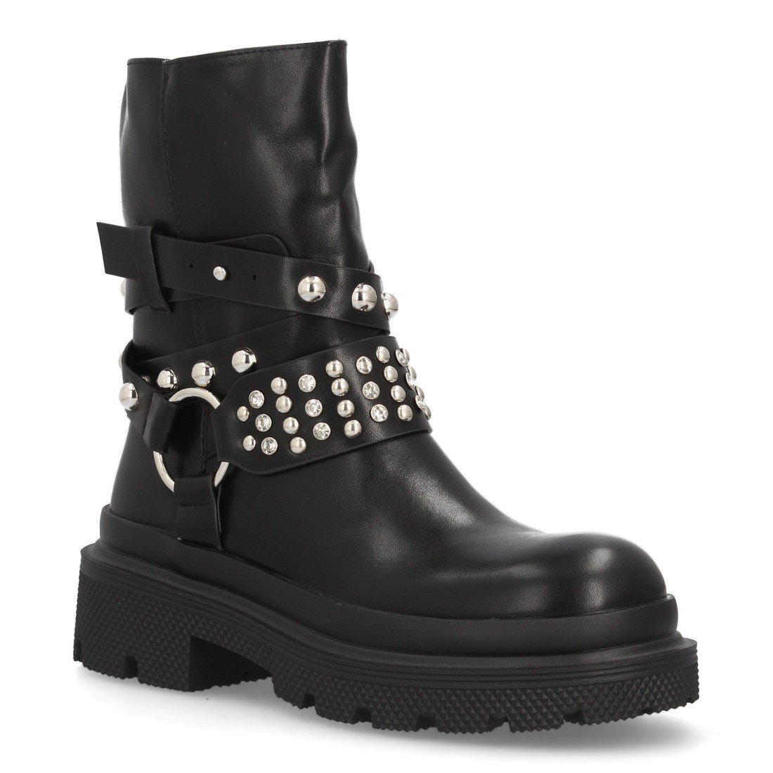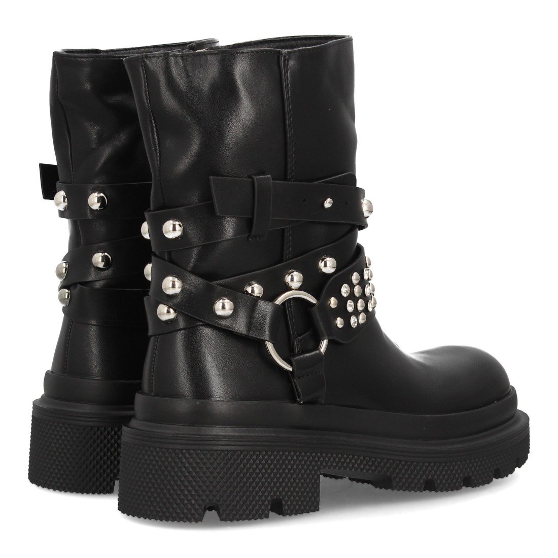 Botas para mujer con diseño de bandas cruzadas adornadas con tachuelas y remaches y aros metálicos con cierre de cremallera. Ideal Otoño Invierno.