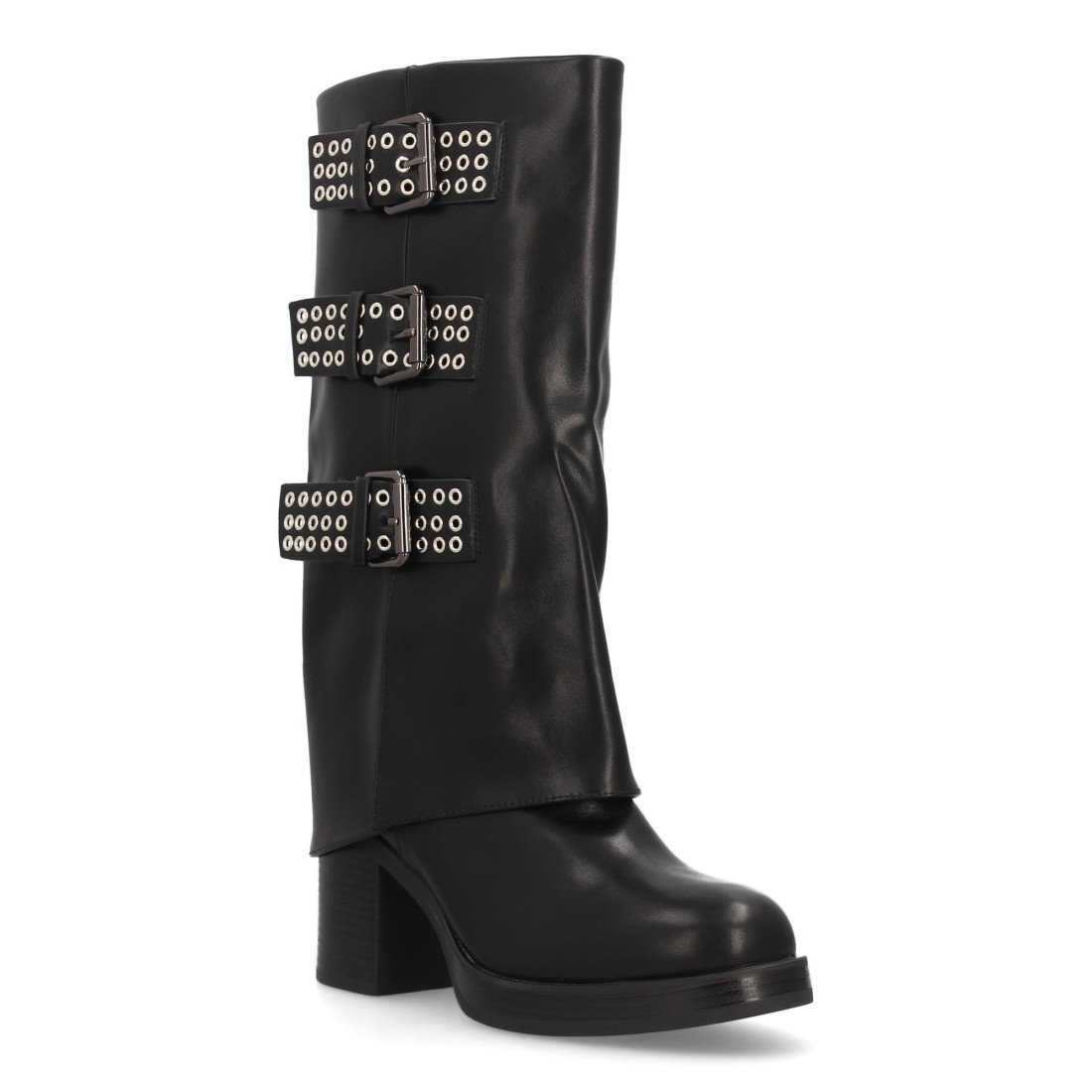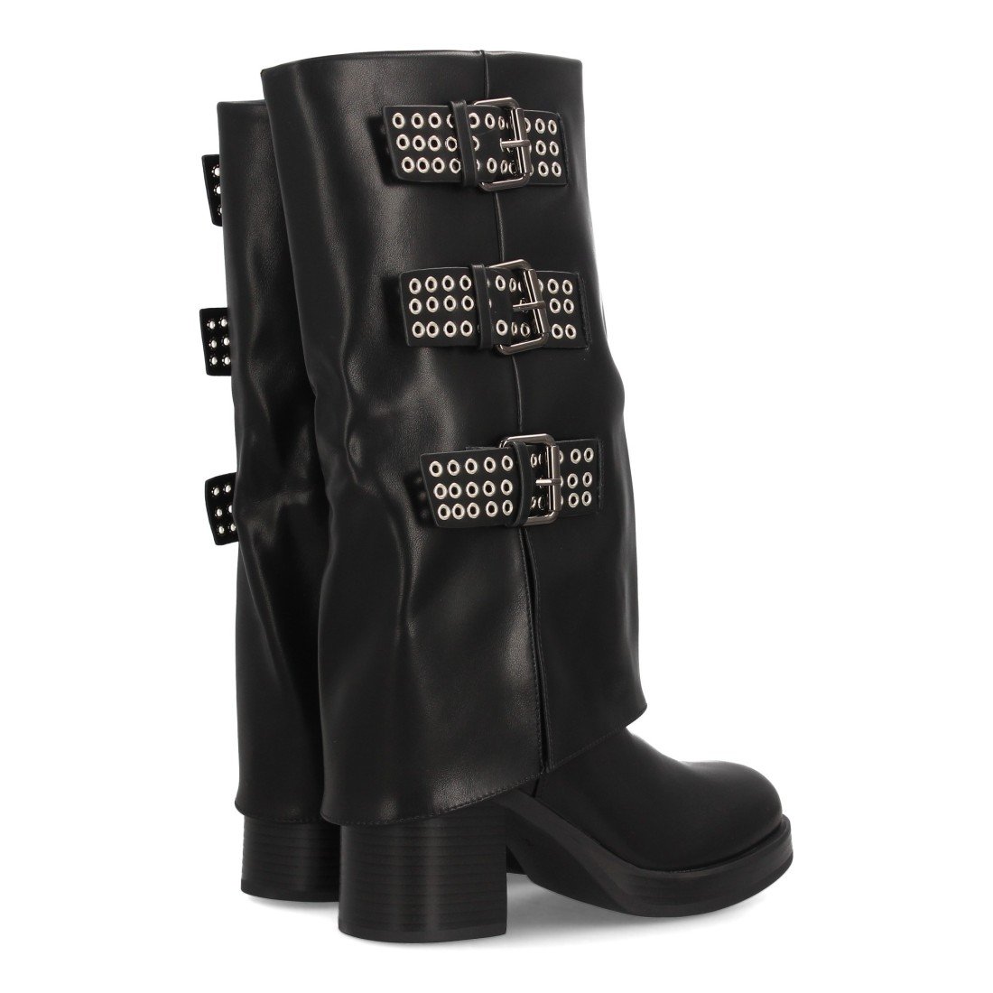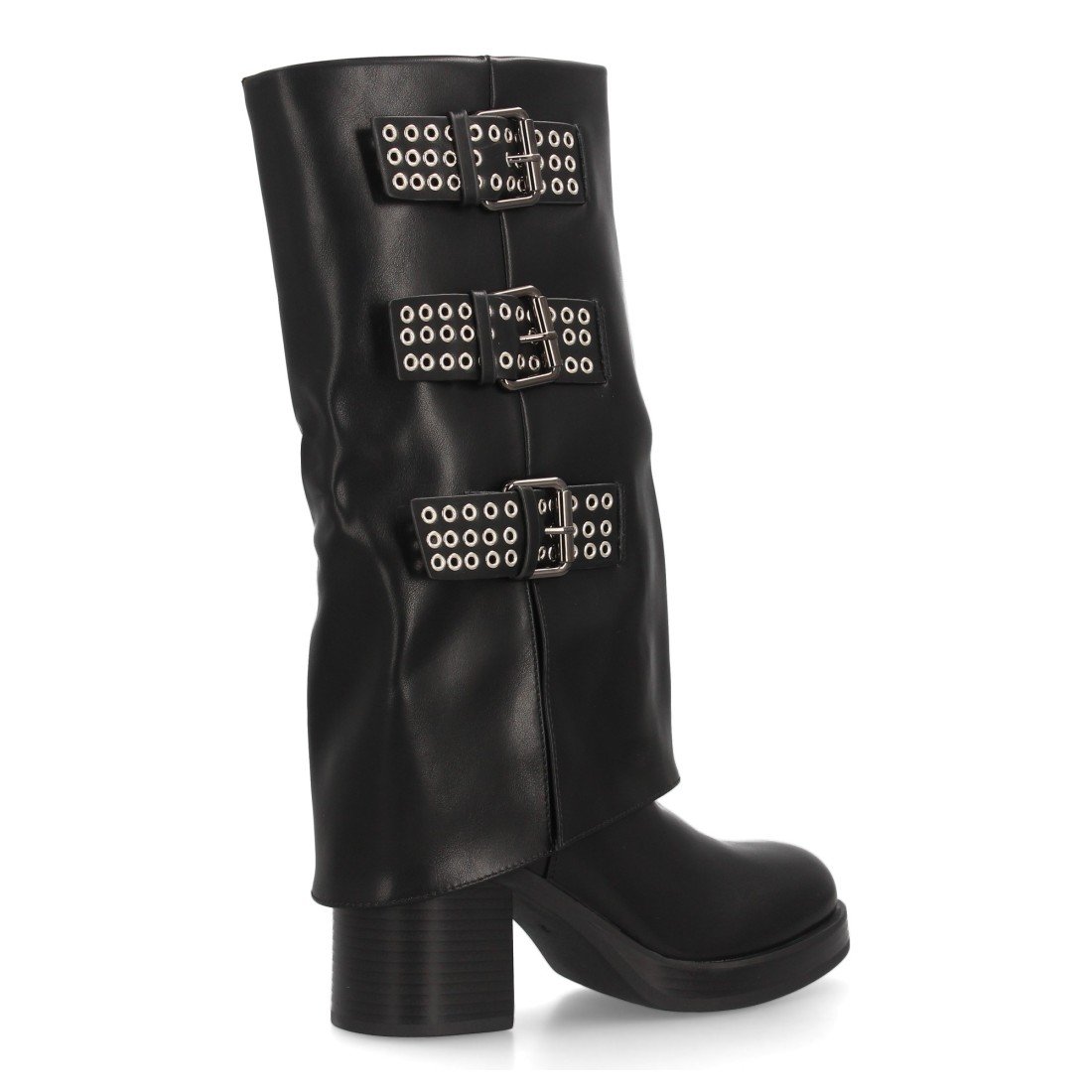 Botas para mujer de tacón y caña alta decorada con tres llamativas hebillas metálicas con ojales. Tacón ancho y cierre de cremallera. Ideal Otoño Invierno.