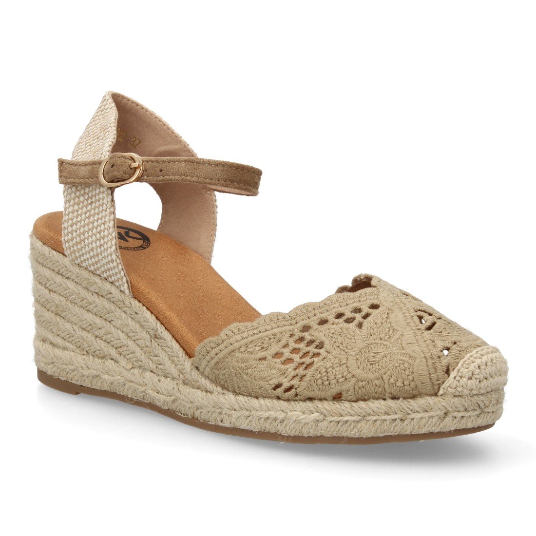 Sandalia valenciana tipo alpargata de cuña para mujer con diseño de adornos calados. Ideal primavera verano. Cierre de hebilla. Ideal para uso diario.
