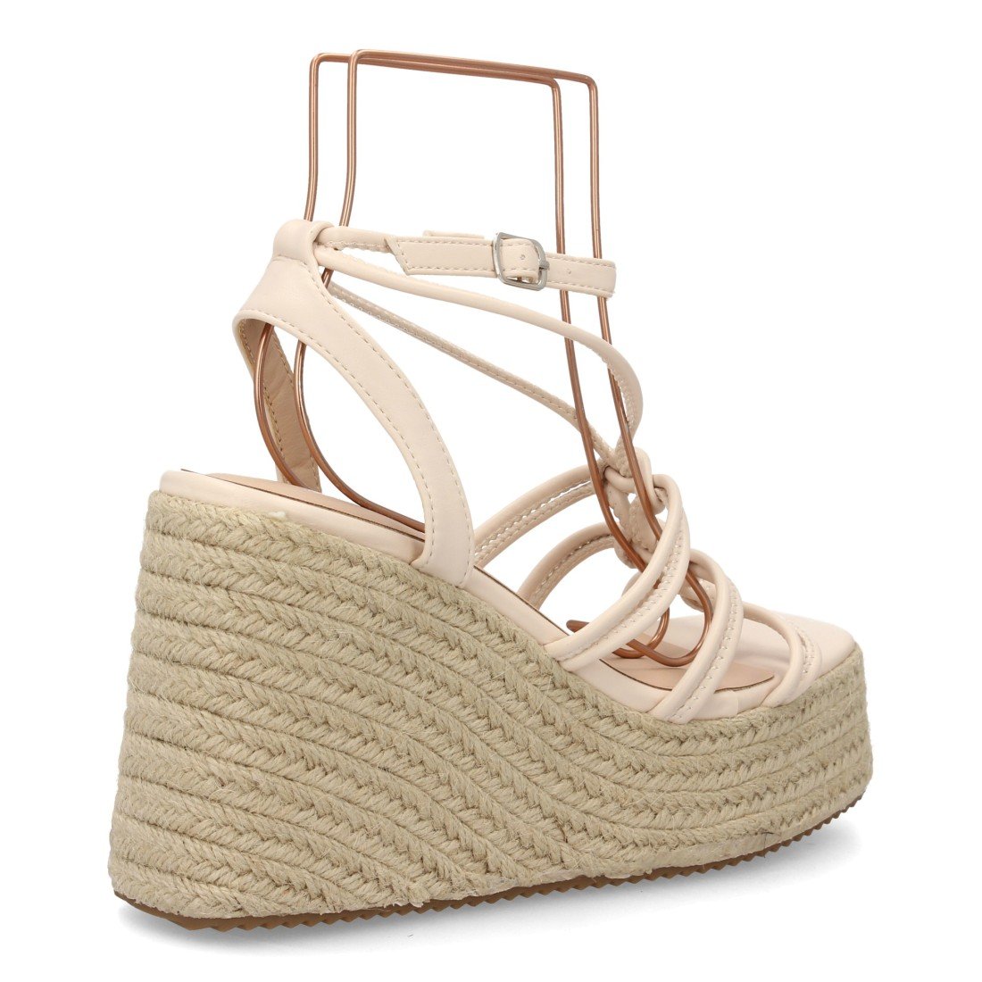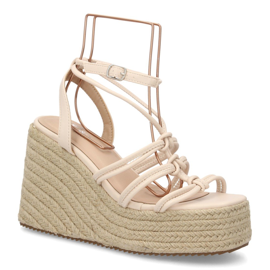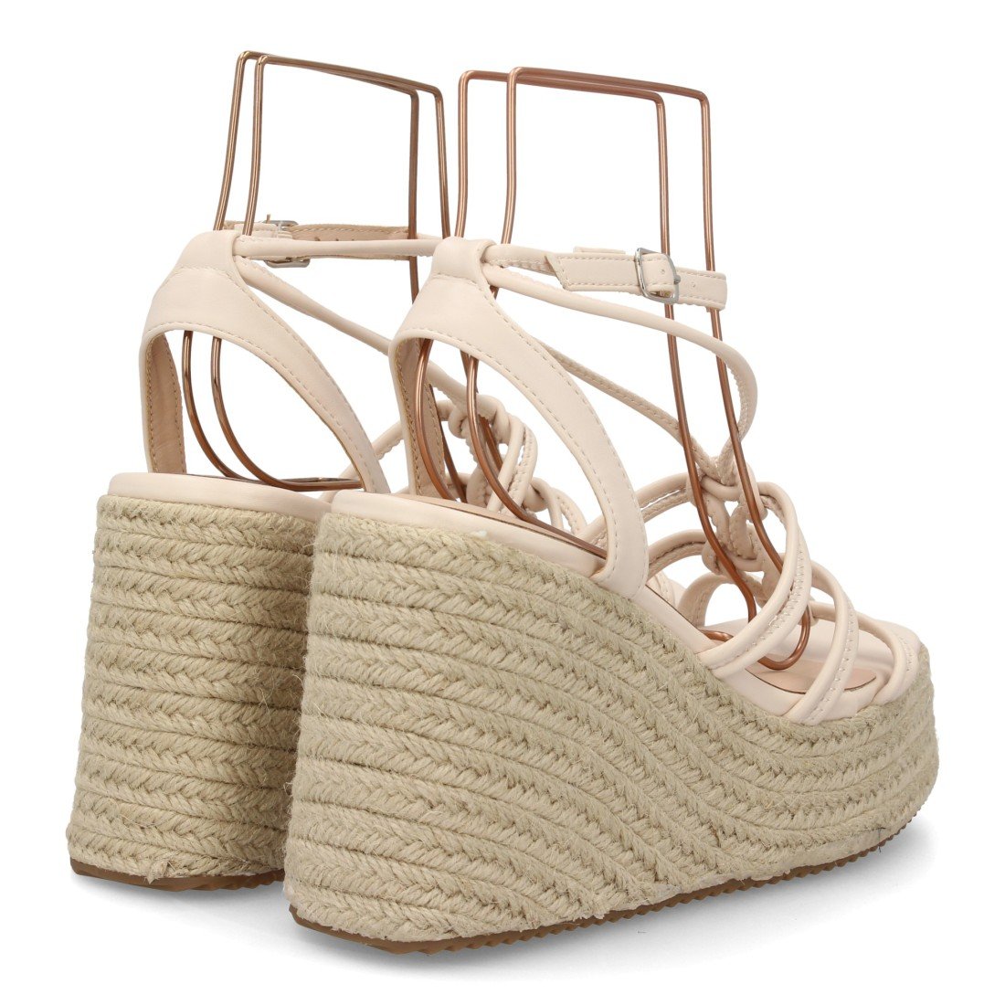 Sandalia de mujer con cuña alta y plataforma de esparto, diseño de tiras múltiples con detalles anudados, de nudos, pulsera al tobillo con cierre de hebilla, ideal primavera verano