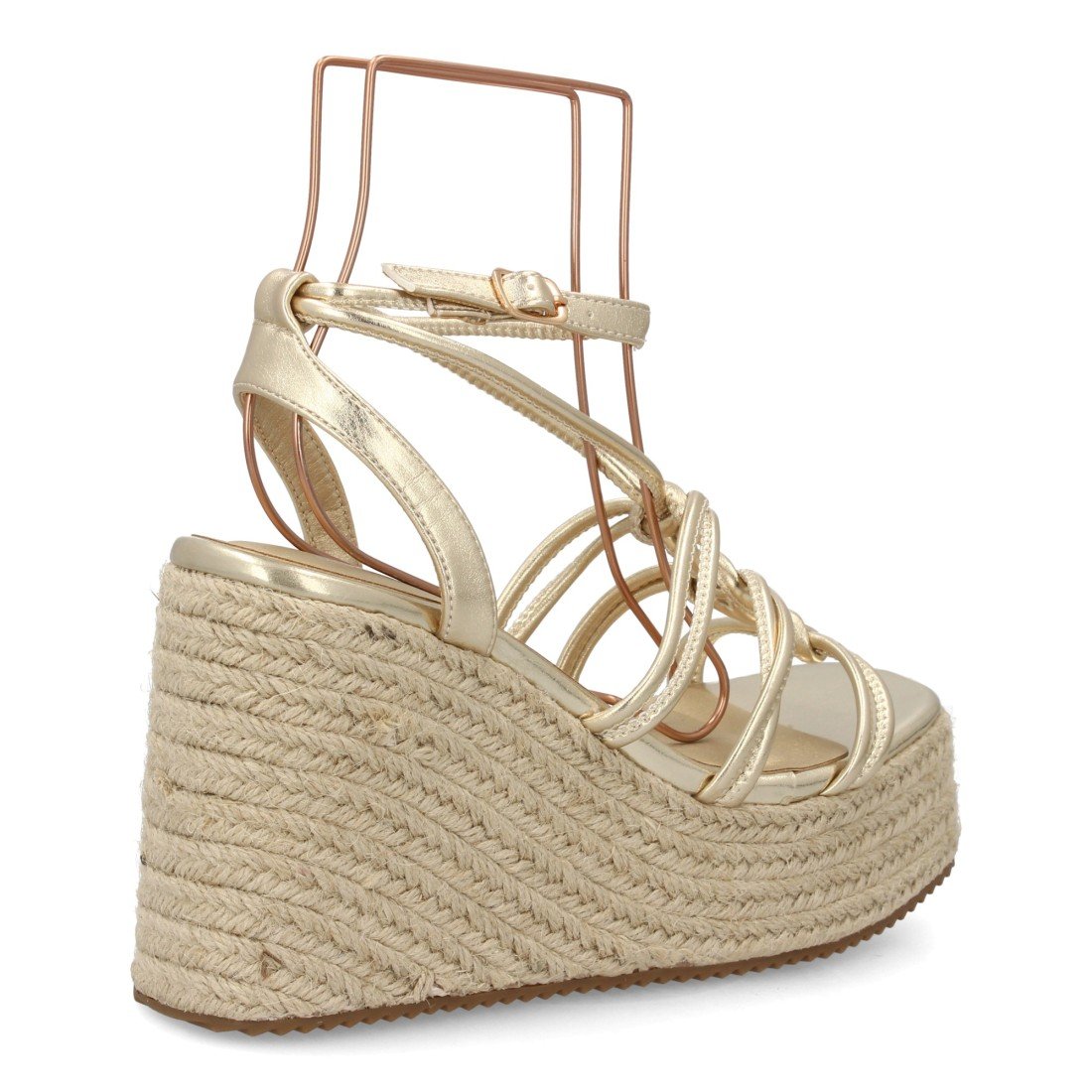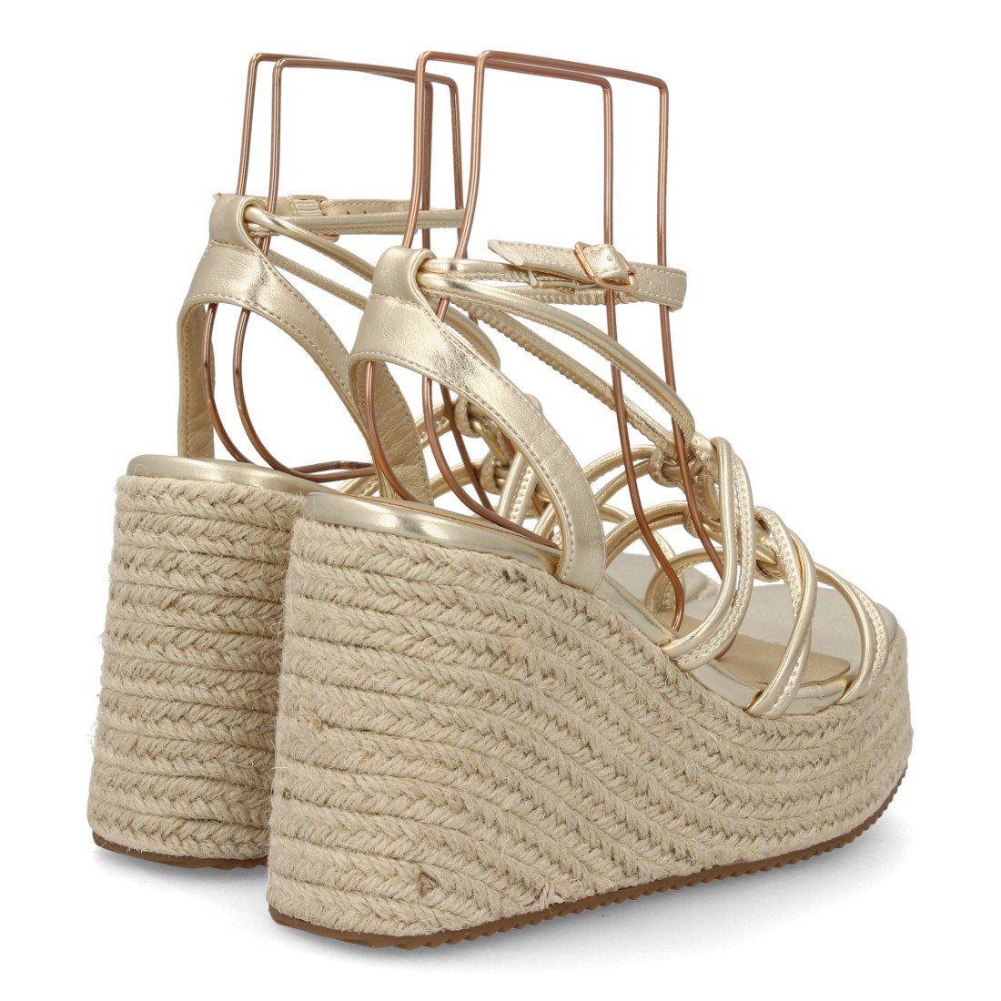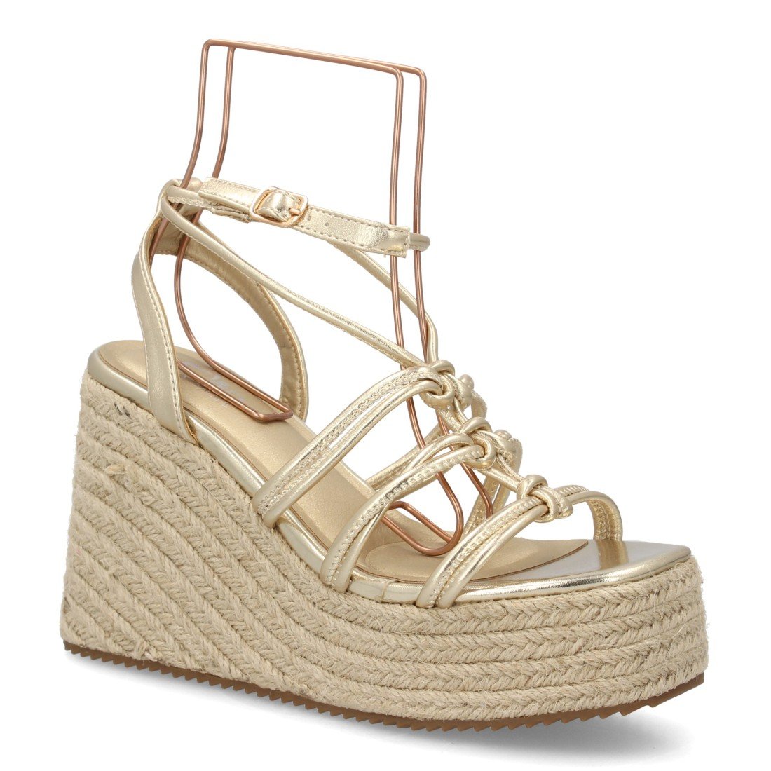 Sandalia de mujer con cuña alta y plataforma de esparto, diseño de tiras múltiples con detalles anudados, de nudos, pulsera al tobillo con cierre de hebilla, ideal primavera verano