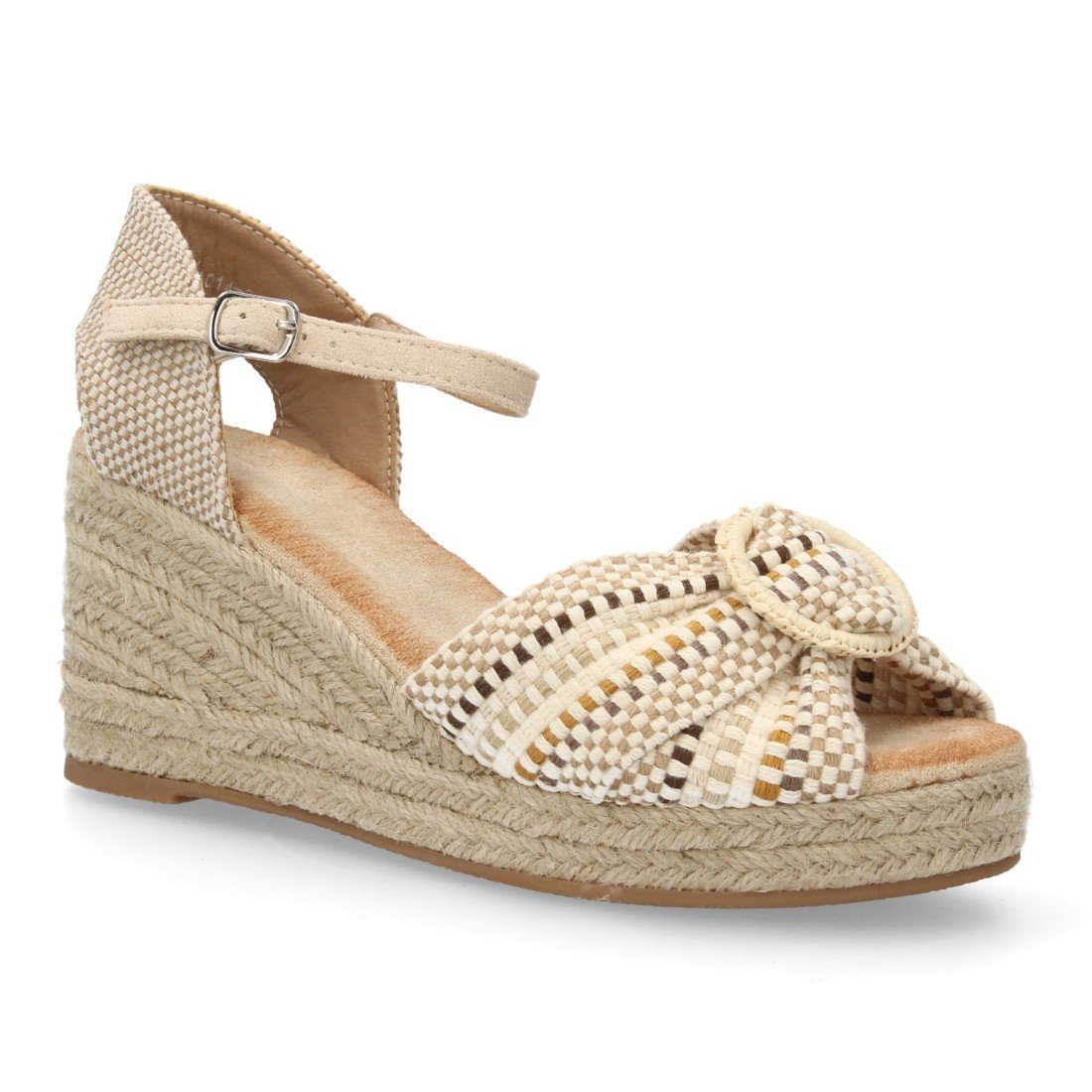 Sandalia de mujer con cuña de esparto, pala con detalle decorativo tipo lazo. Cuña cómoda, ligera y acolchada. Ideal para looks de verano, vacaciones o eventos.
