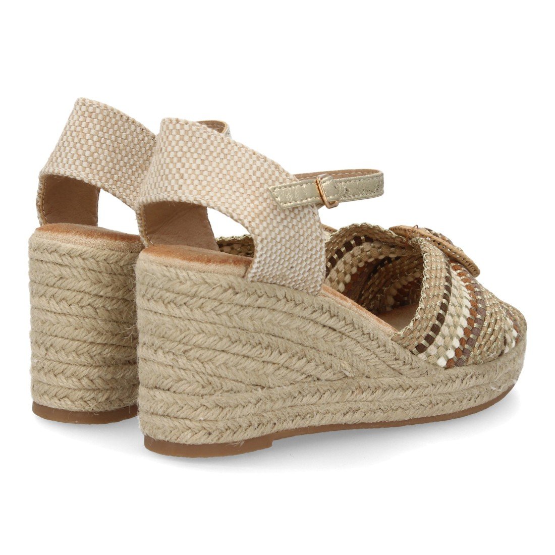 Sandalia de mujer con cuña de esparto, pala con detalle decorativo tipo lazo. Cuña cómoda, ligera y acolchada. Ideal para looks de verano, vacaciones o eventos.