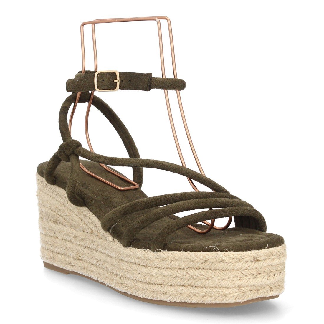 Sandalia de mujer con cuña y diseño de tiras finas, nudos decorativos y plataforma de yute, suela ligera, acolchada y cómoda. Cierre de hebilla, ideal verano.