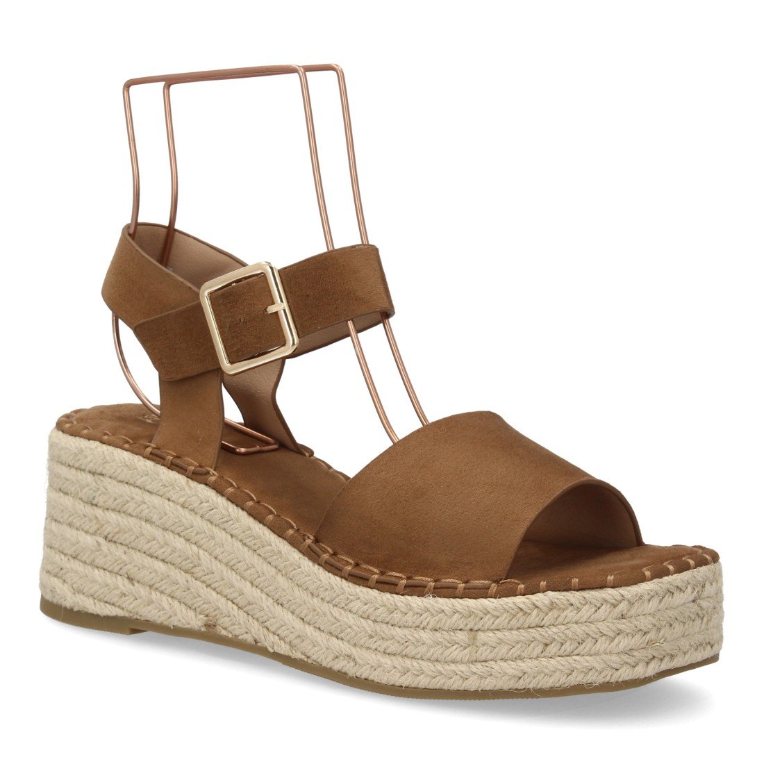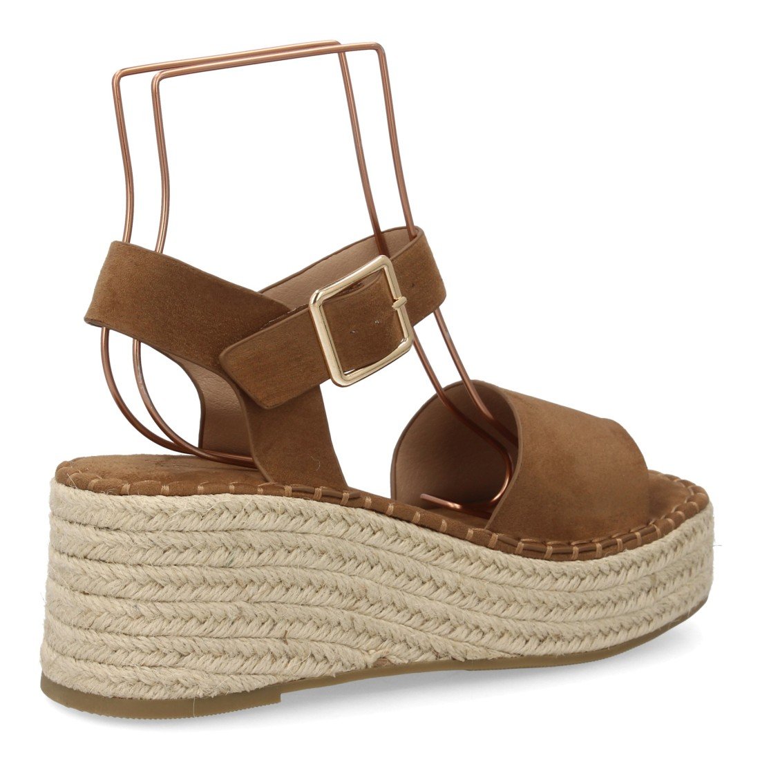 Sandalia de mujer con cuña de yute, acolchada y ligera para el día a día. Tira ancha y cierre de hebilla con estampado liso. Ideal verano.