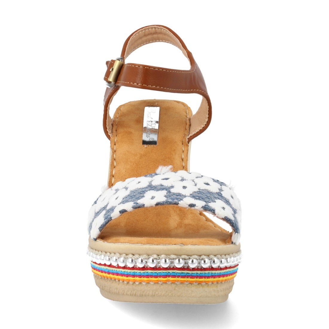 Sandalias de yute con cuña y plataforma, detalle de flores bordadas y cierre de hebilla en el tobillo. Altura: 9,5 cm. Plataforma: 3,5 cm.