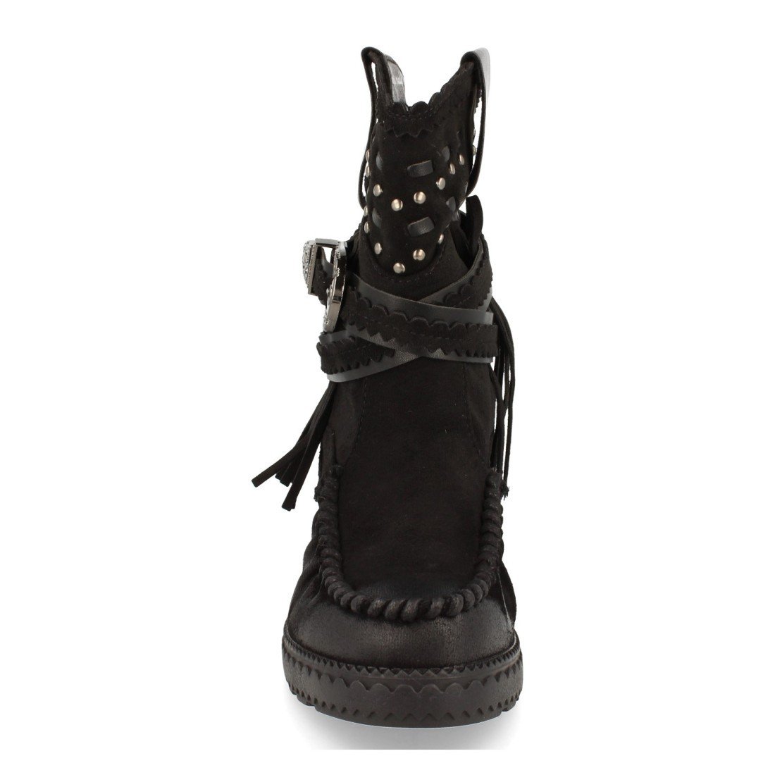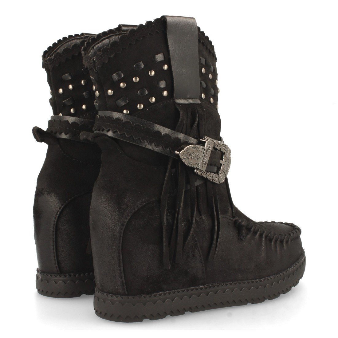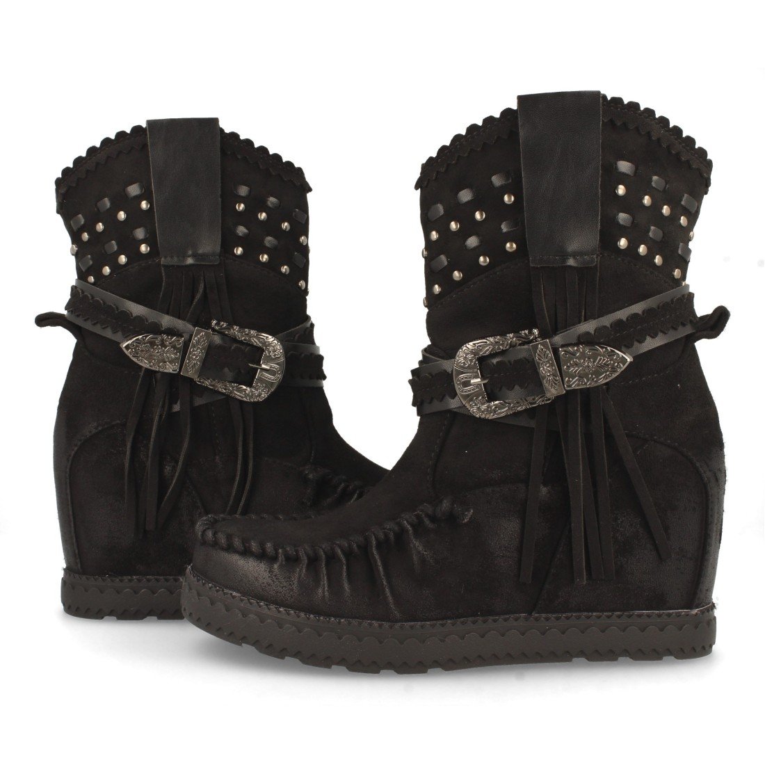 Bota de Estilo Indio, Correas con Hebilla, Flecos en Caña, Cuña Interior, y Cierre de Cremallera, Otoño Invierno 2020