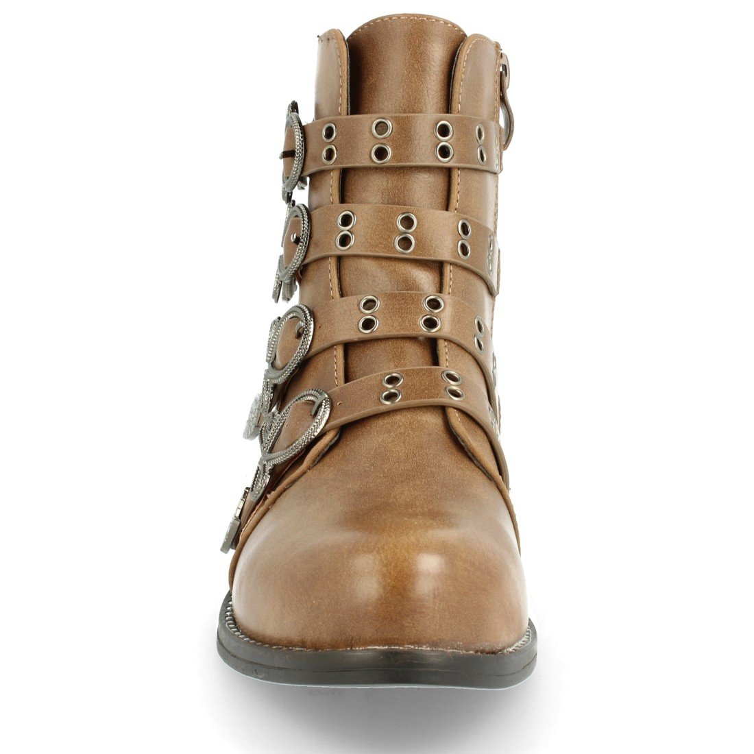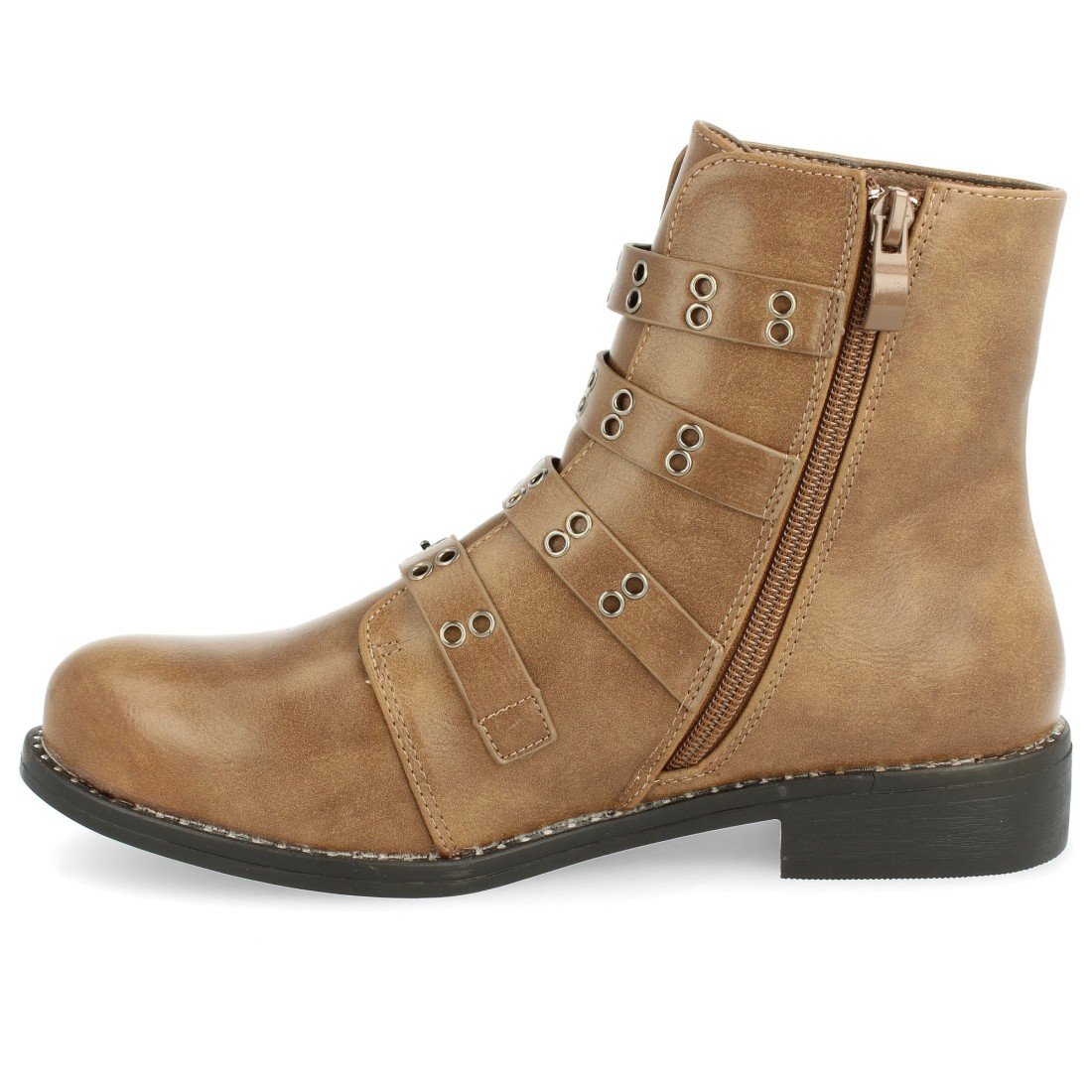 Botín plano de punta redonda con cierre de cremallera en el interior y correas con hebillas ornamentadas a lo largo del empeine como detalle.