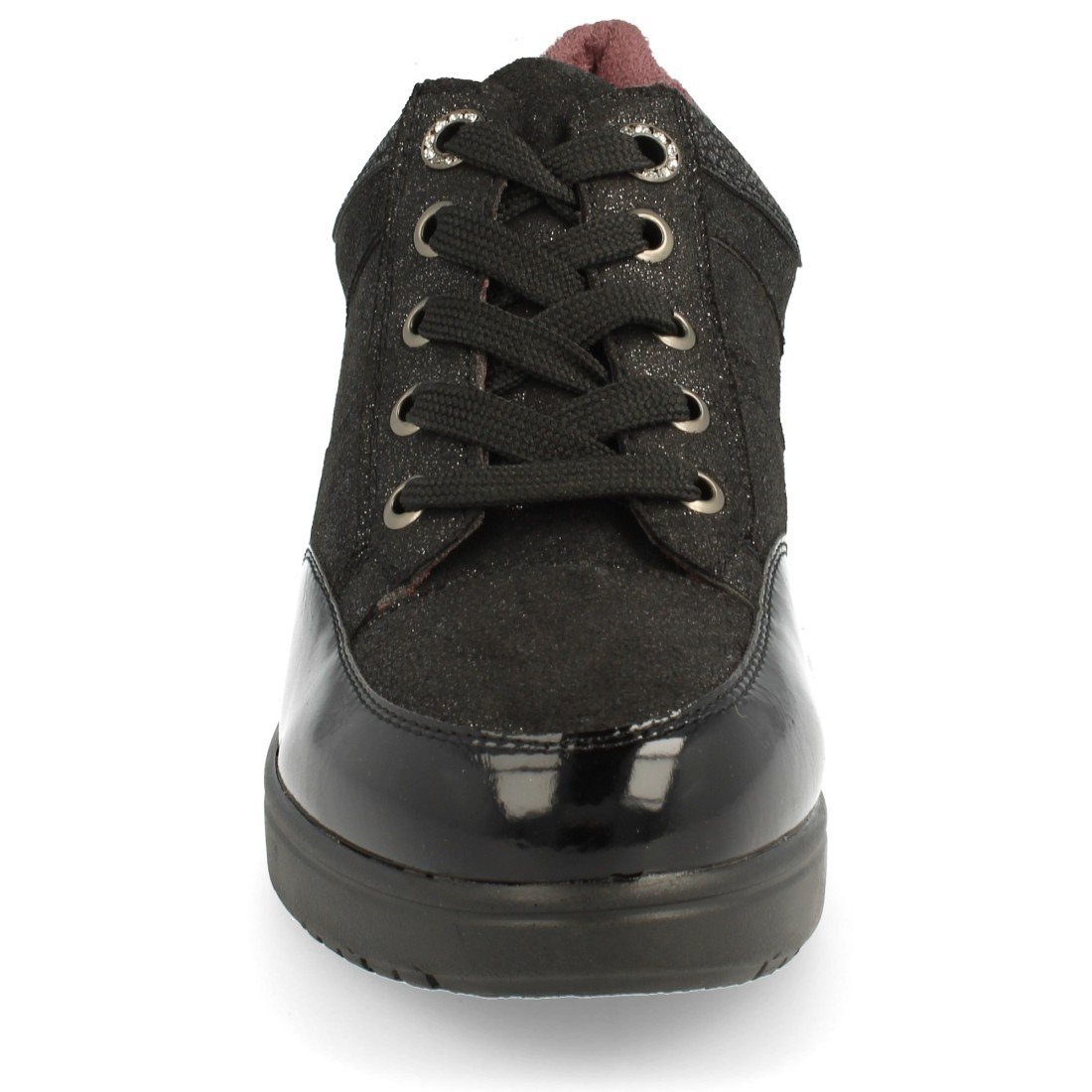 Zapato tipo sport con cordones y cuña. Detalles de charol. Planta de piel. Altura: 3 cm.