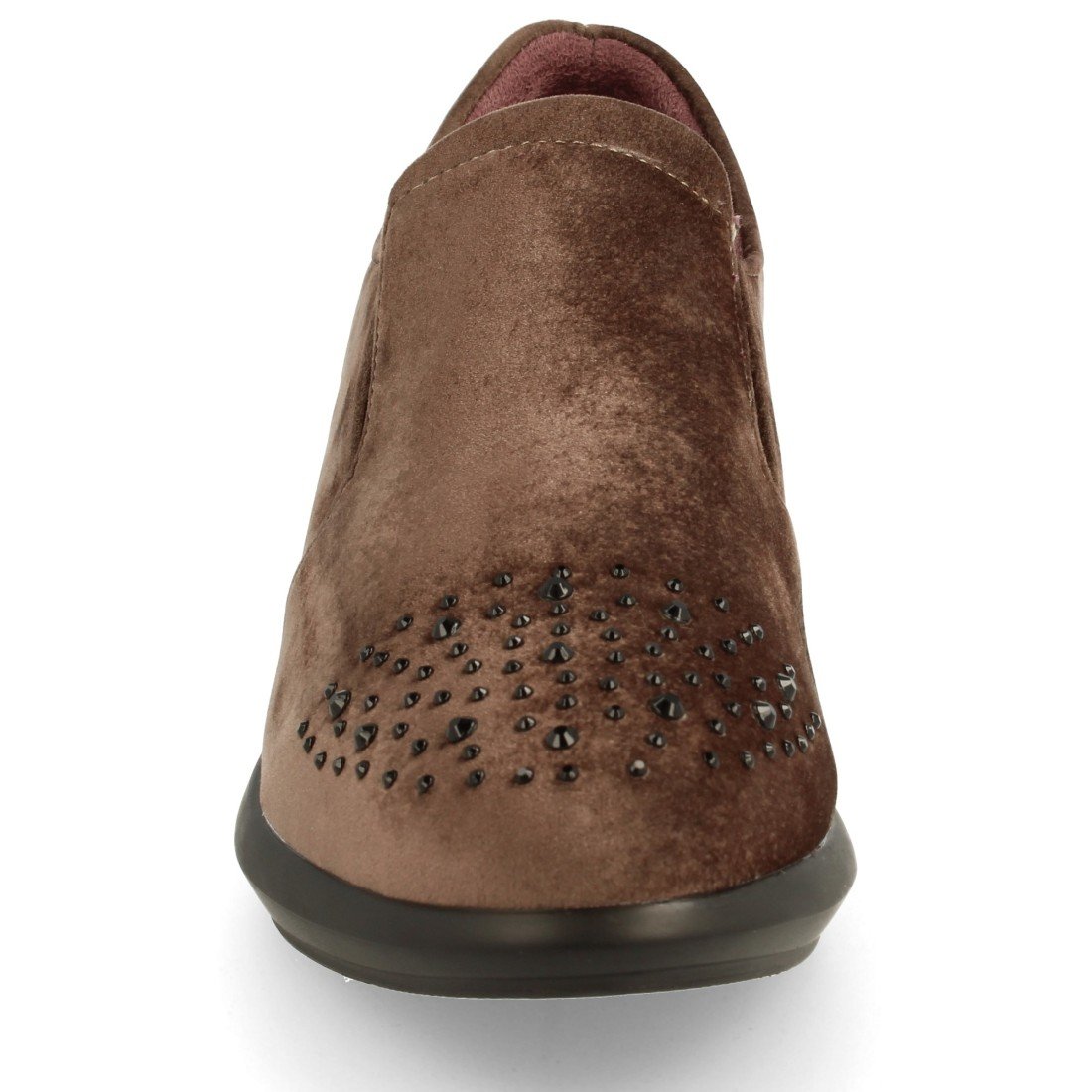 Zapato de cuña con elásticos y detalles de pedrería en la punta y planta de piel. Altura: 3 cm.