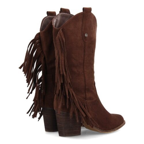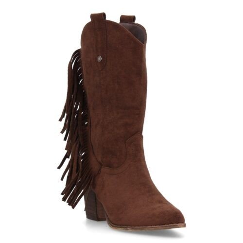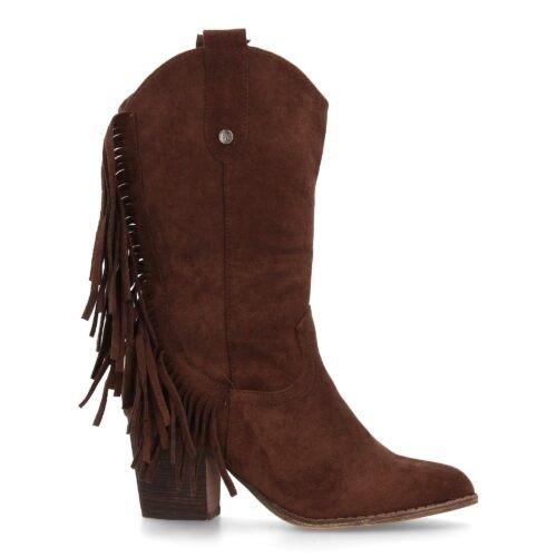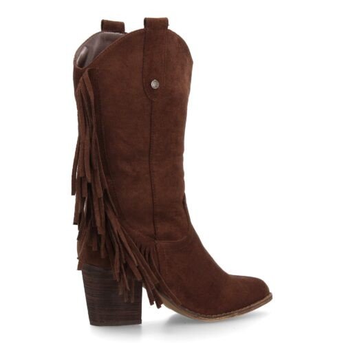 Bota de media caña cowboy con detalle de flecos laterales. Tacón ancho de altura media y tiradores. Cierre lateral con cremallera ideal temporada otoño invierno.