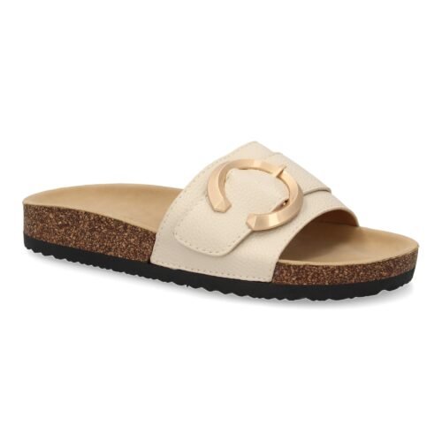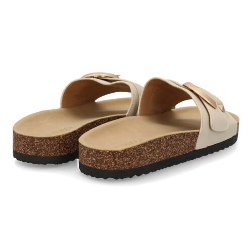 Sandalia plana de mujer comoda y elegante diseño moderno con material bio detalle metalico en la pala ideales para primavera verano.