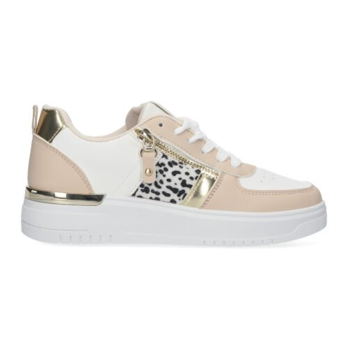 Zapatillas de mujer cómodas de color blanco con detalles de animal print y dorado y adorno de cremallera dorada